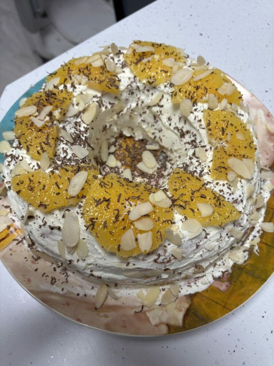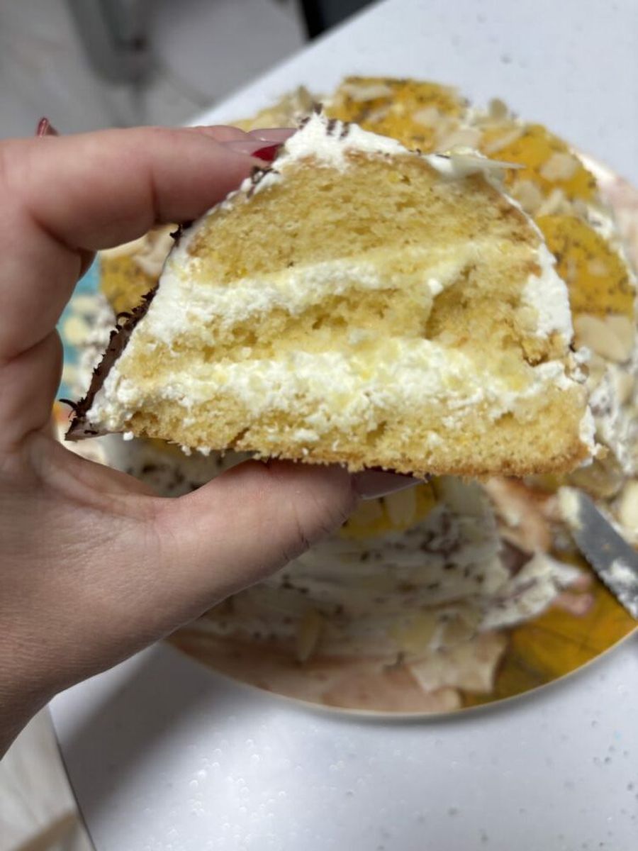 Зʼїли в мить:) Цедра цілого апельсину пішла. Я поклала 205 гр. борошна, але на мій смак коржі все одно недостатньо вологі. Але це мій особистий смак. Люблю багато начинки, крему і не можу їсти суху випічку 🫣😀 тому кекс розрізали на три частини і додали більше крем-чізу та вершків. Він дуже крихкий вийшов, але беззаперечно смачний.