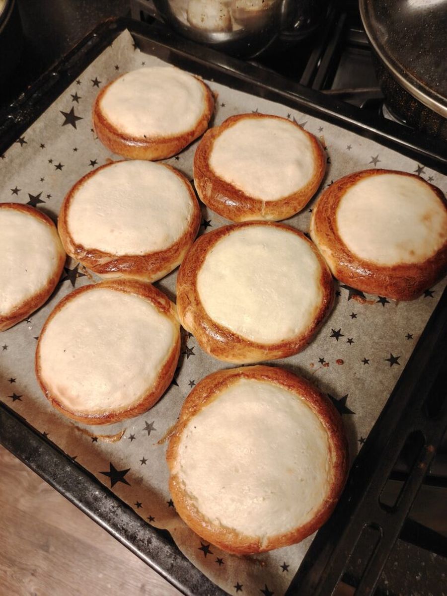 При выпечке этих булочек следует учитывать какие дрожжи используете, так как технология разная. Сухие активные дрожжи не нужно размачивать в молоке, можно добавлять сразу в муку, никакой “шапочки” образовываться не будет, так как это уже готовые к применению дрожжи в отличие от живых дрожжей.