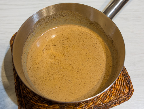 Сливки (1) вливаем в сотейник, добавляем кофе, перемешиваем и доводим до кипения.