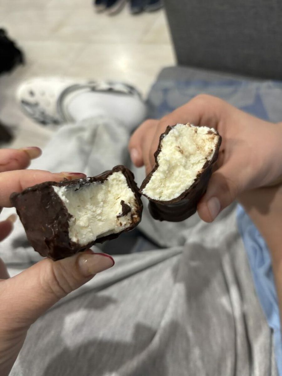 Сделала по рецепту, очень вкусные сырки получились, у меня правда не было подходящей формы для сырков, заморозила творог в силиконовой форме для кексиков, потом обмакивала его в расплавленный шоколад, получилось что-то напоминающее зефирюшки Шармель по виду и немного по вкусу))