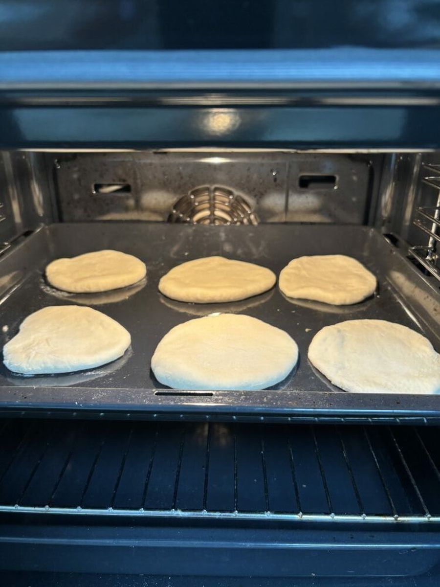 Кладем лепешки на разогретый противень и быстро отправляем в духовку. Выпекаем до вздутия и приобретение легкого золотистого цвета, по 7-5 минут.
