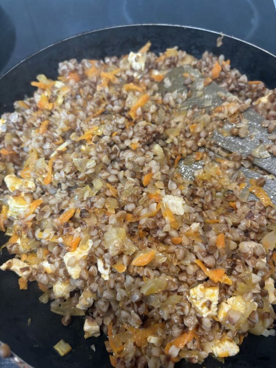 Вот почти так же я готовлю гречку с измельчёнными, как на икру, опятами. Вкусно очень!