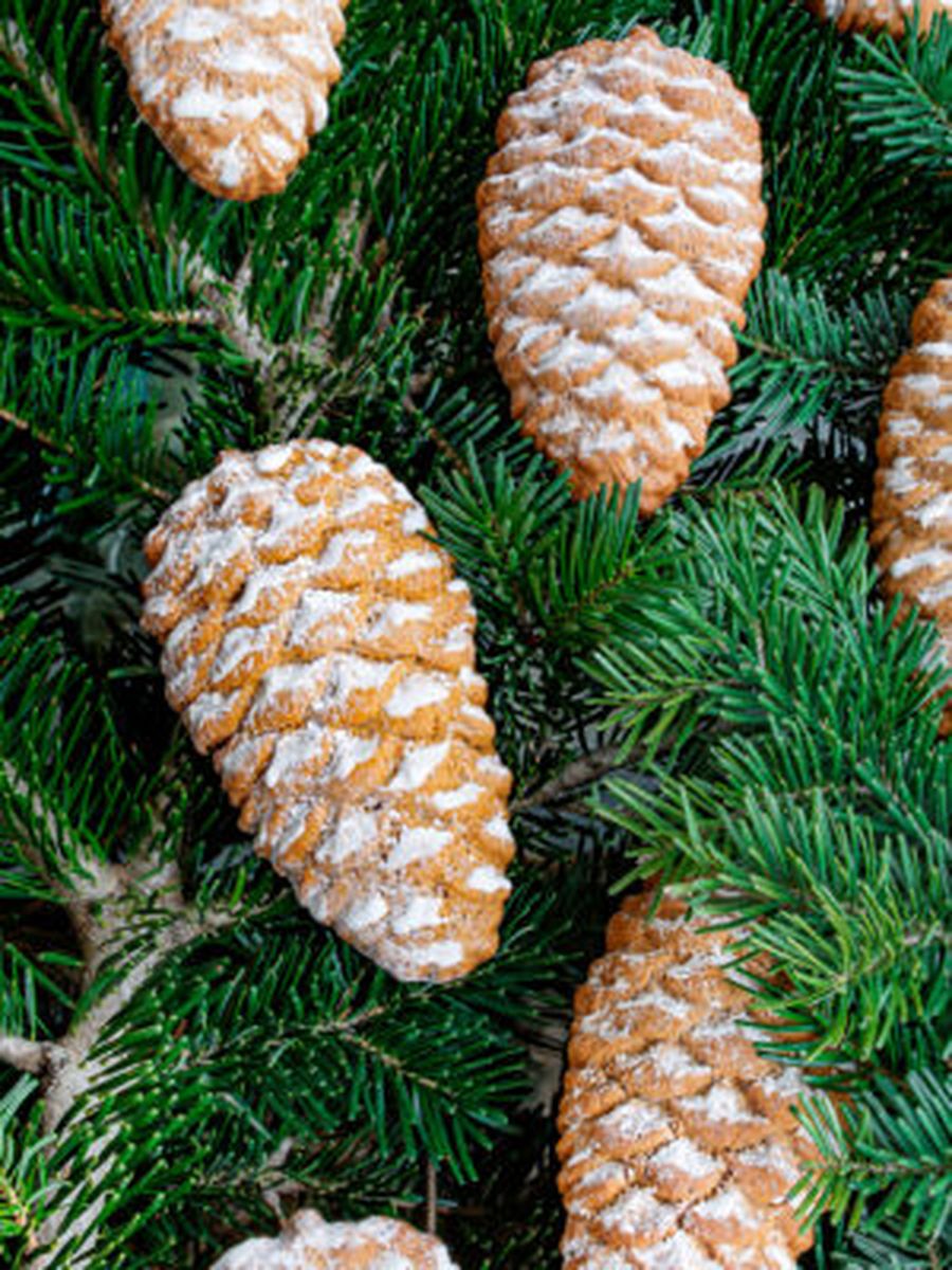 Декорируем шишки глазурью с помощью мешка и кисточки, слегка присыпаем сахарной пудрой.