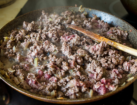 В сковороде на средне сильном огне разогреваем 2 ст.л. растительного масла. Кладем мелко нарубленный лук и жарим, помешивая, 3-4 минуты. Кладем тмин и чеснок, жарим 1 минуту. Добавляем фарш и жарим, разбивая лопаткой комочки, пока мясо не потеряет розовый цвет, около 10 минут. Снимаем с огня.