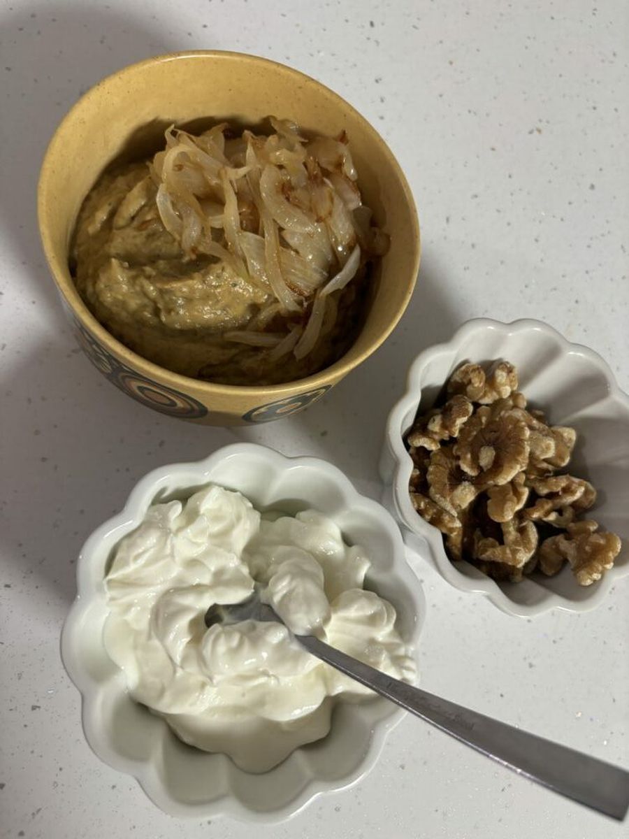 Перемешиваем. Подаем с грецкими орехами, отложенным жаренным луком и дополнительным йогуртом. Плюс можно дополнительно посыпать куркумой.