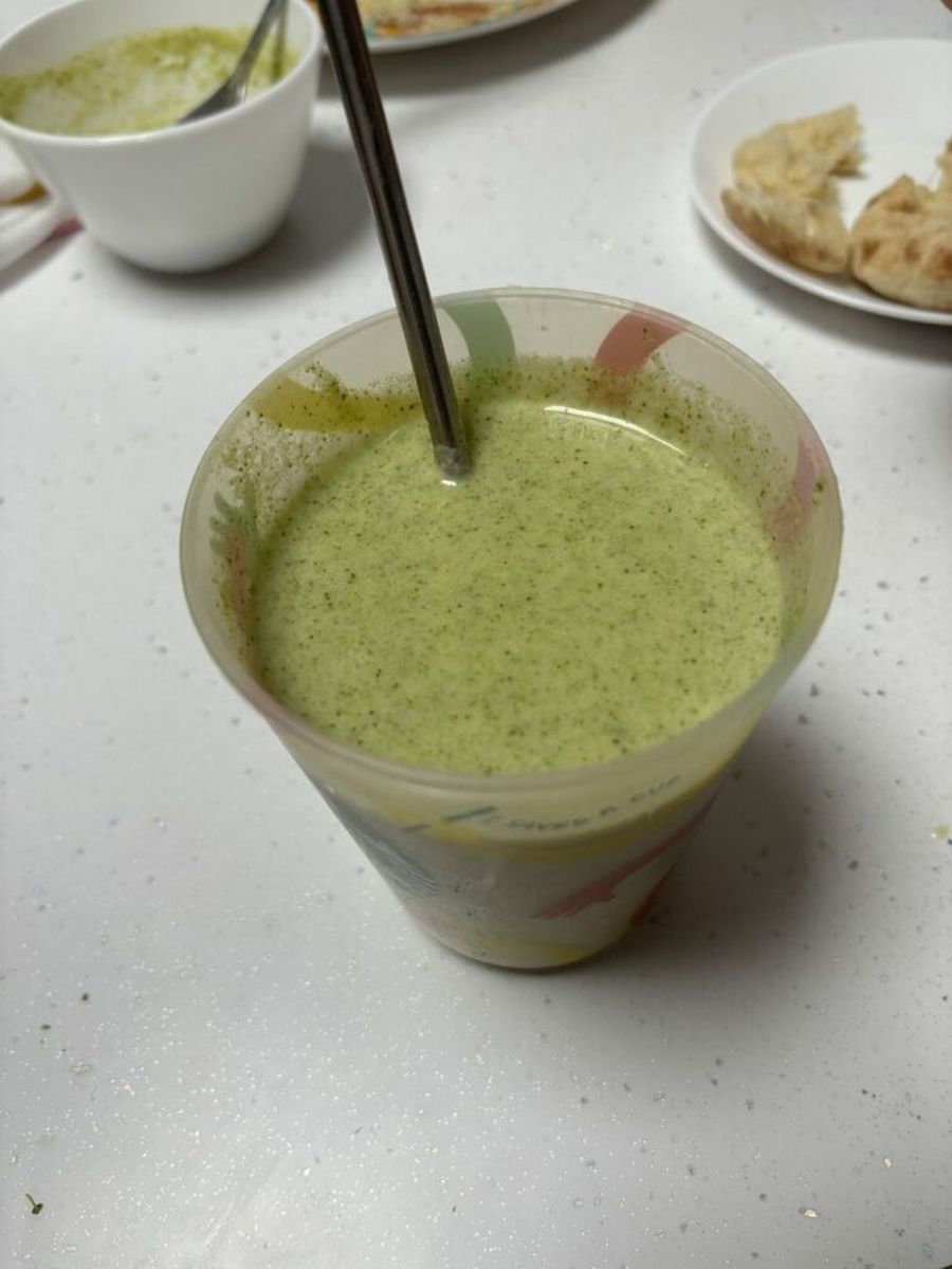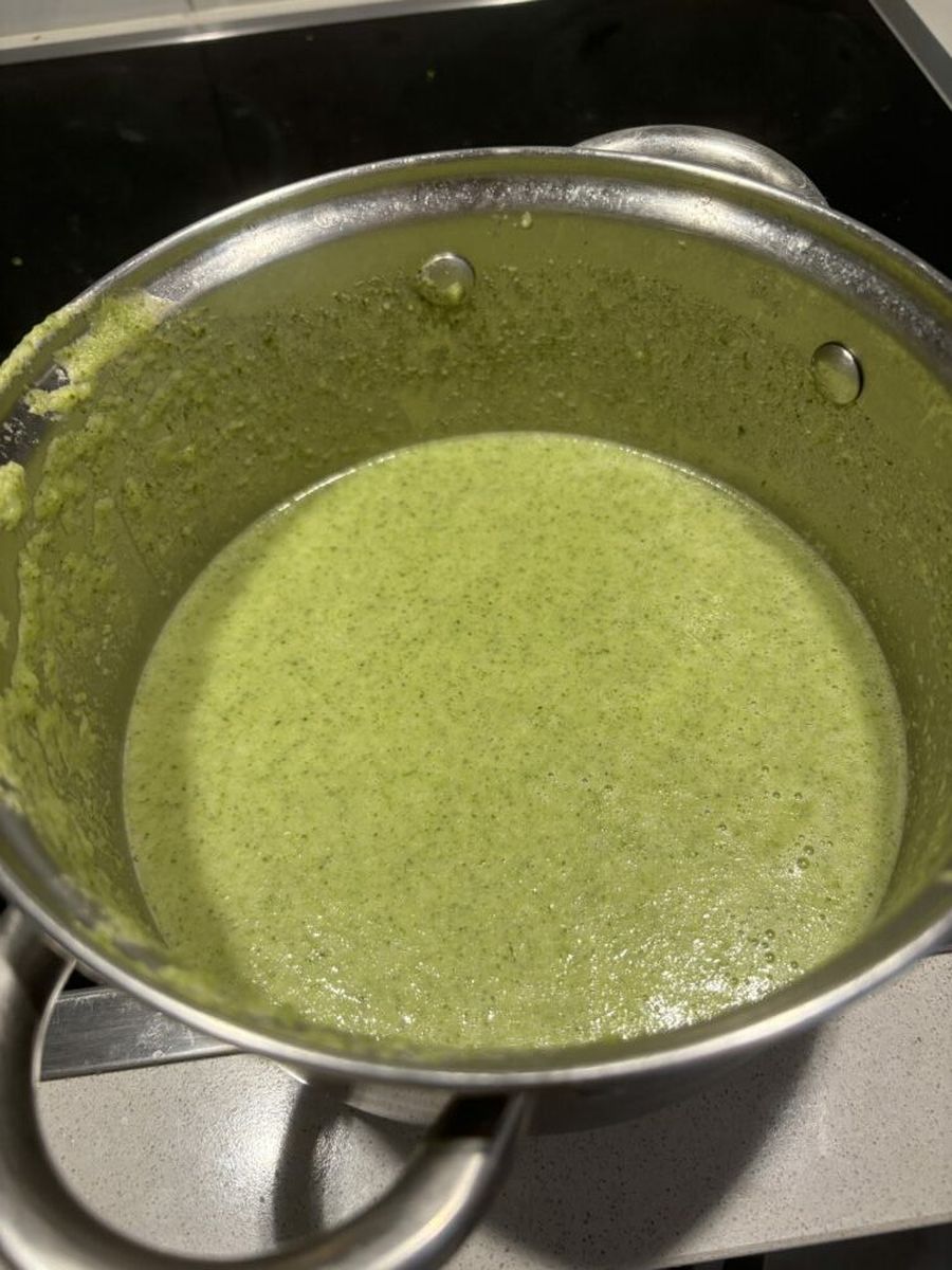 У меня была пожелтевшая брокколи, цвет получился не очень. Но ситуацию удалось спасти замороженным шпинатом, который облагородил слегка болотный оттенок до нежного зеленого!