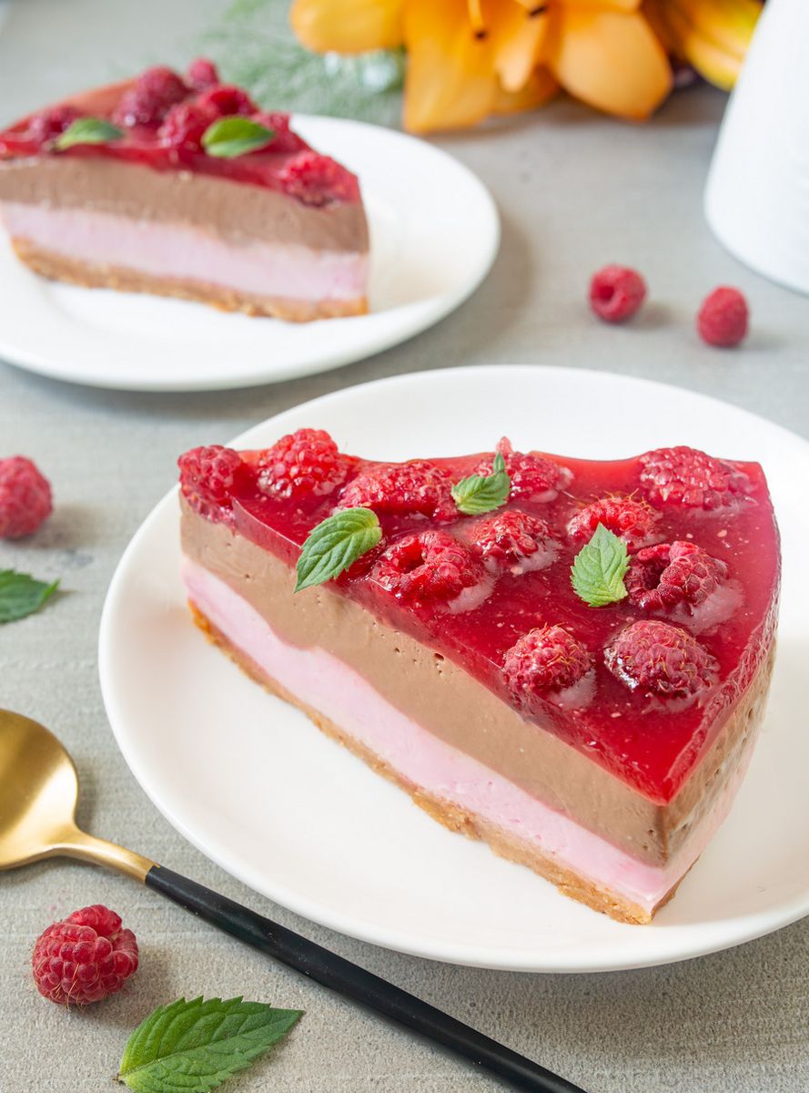 На застывший шоколадный крем выкладываем отложенную целую малину и заливаем малиновым желе. Снова отправляем в холодильник и даем желе застыть.