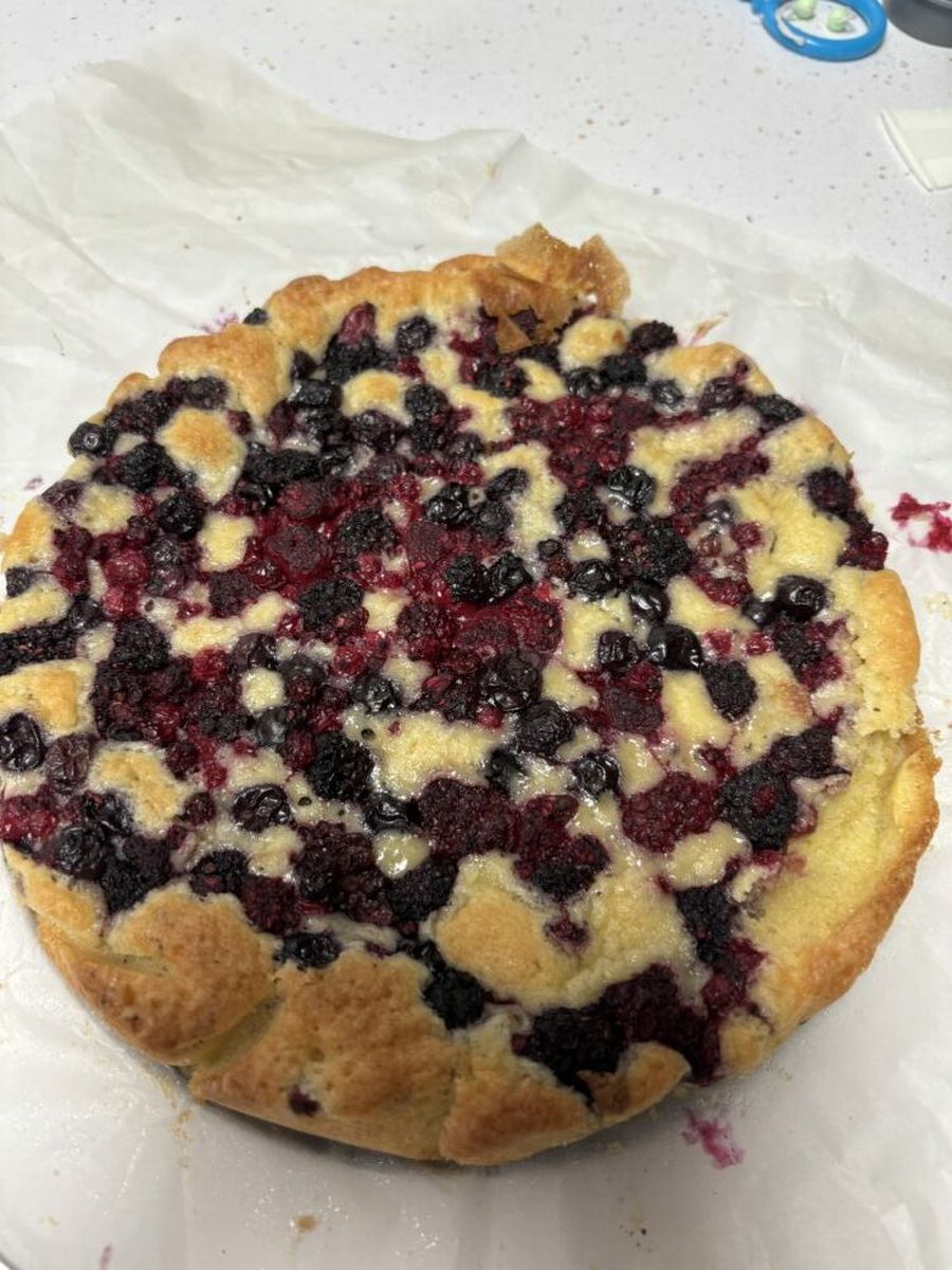 Дуже смачний пиріг. Робили з ягодами лісовими. Помилка, яку я зробила – це розморожені ягоди, які не дали пропектися пирогу всередині, тому прийшлося допікати. Або свіжі, або заморожені 😉