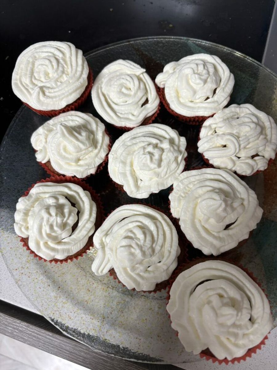 При помощи кондитерского мешка с насадкой высаживаем крем на кексы.