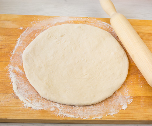 Берем один шарик теста, обминаем. Раскатываем в лепешку толщиной около 8-10 мм.