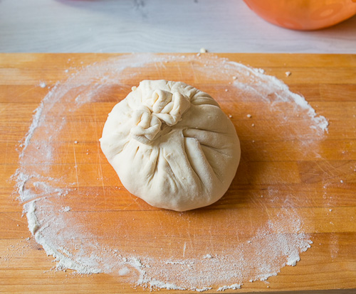 Собираем тесто в узелок вокруг начинки. Хорошо защипываем. Излишек отрываем и убираем в сторону.