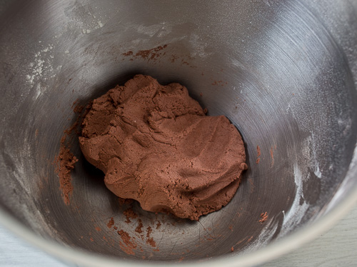 Я сделала так – раскатала белое тесто прямо на противне, а сверху – черное, свернула и прямо на мороз, так как в морозилку противень не помещается)