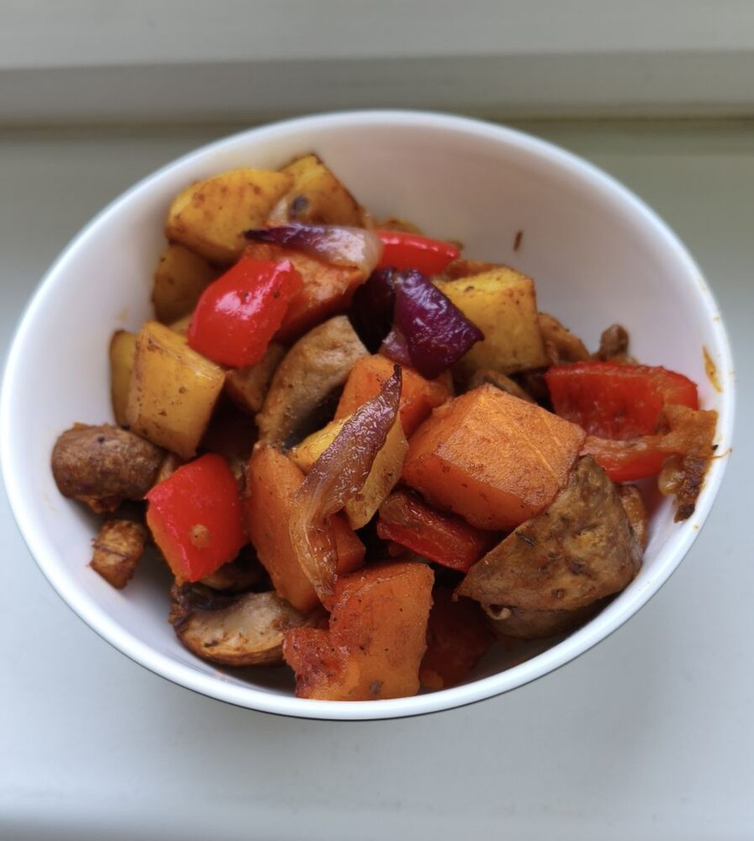 Из отличий – был батат, а не тыква и рискнула добавить вместе с перцем замороженной стручковой фасоли, слегка разморозив и обсушив до этого. Все отлично