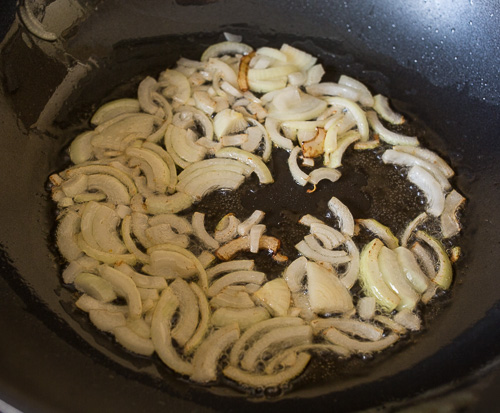 В сковороде на средне сильном огне разогреваем растительное и сливочное масло. Кладем лук и жарим, помешивая, 3-4 минуты.