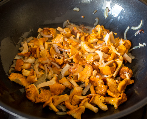 Добавляем лисички и жарим до готовности, около 7-8 минут. Солим по вкусу и добавляем мелко нарубленный свежий чеснок.