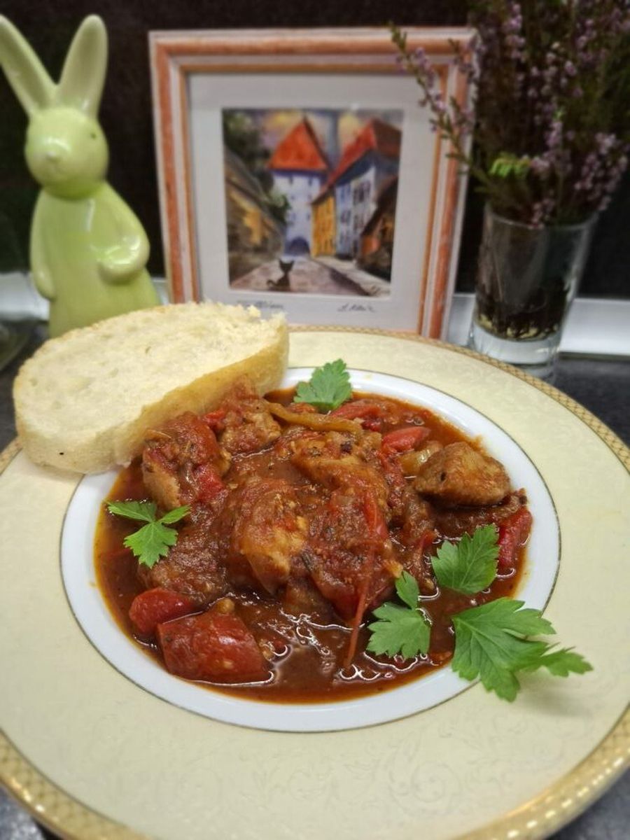 Вельмі проста гатуецца і смачна атрымоўваецца! З насычаным смакам перцаў, характэрнай памідорнай кіслінкай і нежным мясам. Гатавала строга па рэцэпце толькі таматы паклала свежыя, прабітыя блэндэрам.