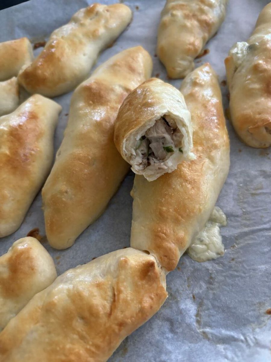 Тонке, смачне тісто з яким приємно працювати. Коли зробила начинку, закралася думка, що буде сухо, але в готовому вигляді це соковито, розплавлений сир і курочка 😋 Хто дуже любить смажену цибульку в начинці, буде дуже доречно, але без цибулі це смачно і соковито 👍🏼 В духовці рівно 12 хвилин 200 градусів.
