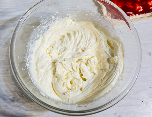 Готовим начинку. Для этого соединяем крим-чиз со сливками, сахарной пудрой и мягким сливочным маслом и взбиваем миксером на средней скорости до однородного состояния.