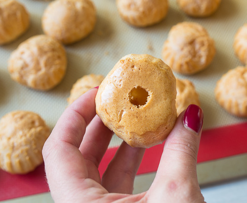 Отправляем в предварительно разогретую до 180 градусов и выпекаем до темно-золотистого цвета, около 30-40 минут. Готовые шу остужаем и проделываем в донышке отверстия ножом.