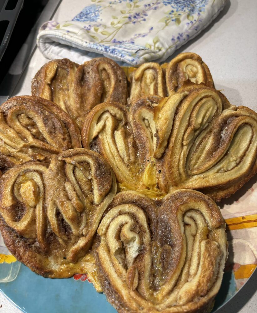 Дуже незвичайне тісто. З ним приємно працювати, але в холодильнику ледь підійшло і на деко більше години стояли – все одно пласкі. Але смачні. Вийшло 7 штук – зʼїли за один раз, ледь одну собі вхопила 😉