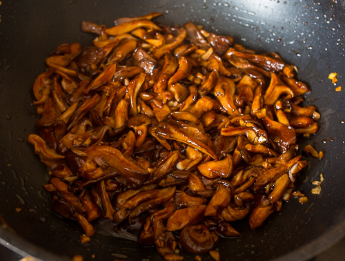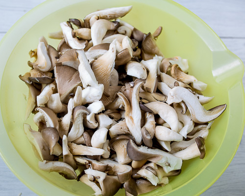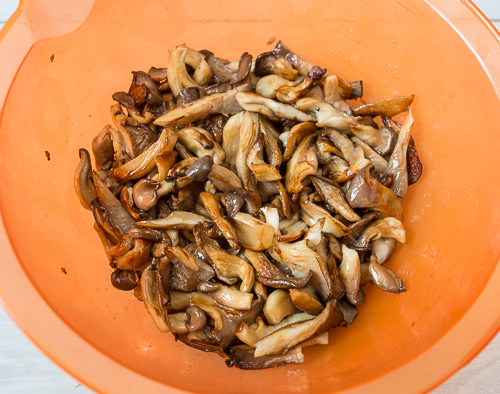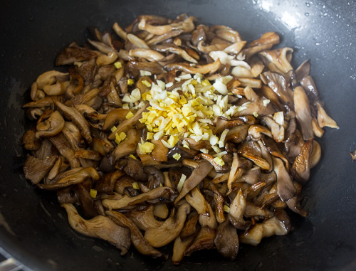 В воке или просто глубокой сковороде на сильном огне разогреваем 2 ст.л. растительного масла. В несколько заходов быстро, по паре минут, обжариваем вешенки до золотистого цвета. Очень важно, чтобы грибов в одном заходе на сковороде было немного и кусочкам не было тесно. Иначе вешенки пустят сок и будут попросту вариться, а не жариться. И в результате вы получите резиновые грибы.