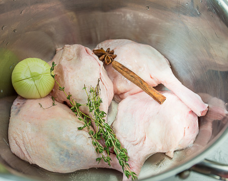 Источник: https://www.vkusnyblog.com/recipe/salat-s-tomlenoj-utkoj-brokkoli-i-orehovoj-zapravkoj/Ножки кладем в кастрюлю. Добавляем корицу, бадьян, тимьян и луковицу.