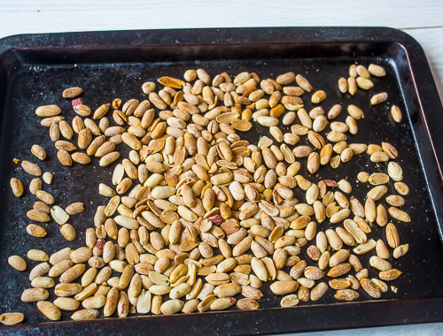 Арахис обжариваем в предварительно разогретой до 200 градусов духовке на противне в течение 5-7 минут. Вынимаем и остужаем.