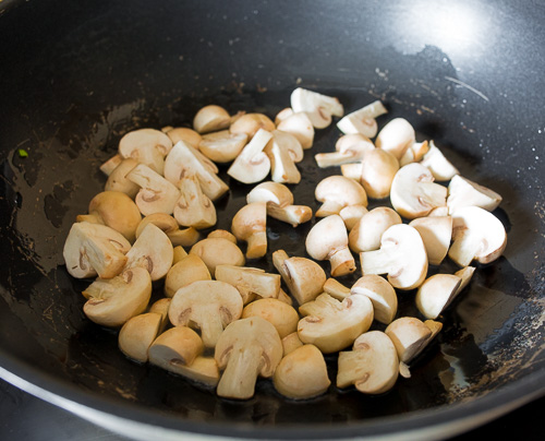 В сковороде на сильном огне разогреваем 2 ст.л. растительного масла. В пару заходов обжариваем шампиньоны до румяной корочки, по 3-4 минуты.