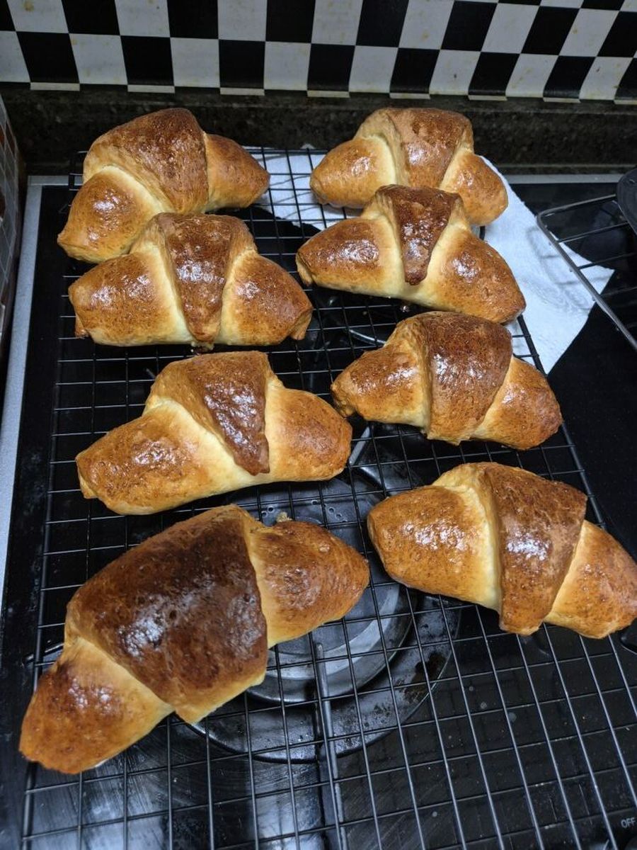 Кладем рогалики на противень и даем подойти в течение 20-30 минут. Затем смазываем взбитым яйцом и отправляем в предварительно разогретую до 200 градусов духовку и выпекаем до готовности и румяной корочки, около 15-20 минут.