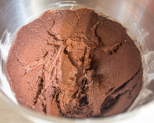Вводим просеянное какао и половину просеянной с разрыхлителем и содой муки. Вымешиваем. Добавляем молоко, вымешиваем. Вводим остаток муки с разрыхлителем и замешиваем тесто.