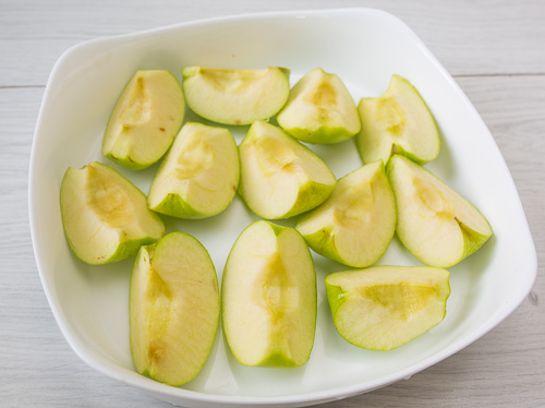 Готовим яблочное пюре. Яблоки разрезаем на четвертинки, вынимаем сердцевину. Кладем на застеленный противень или в форму отправляем в предварительно разогретую до 180 градусов духовку.