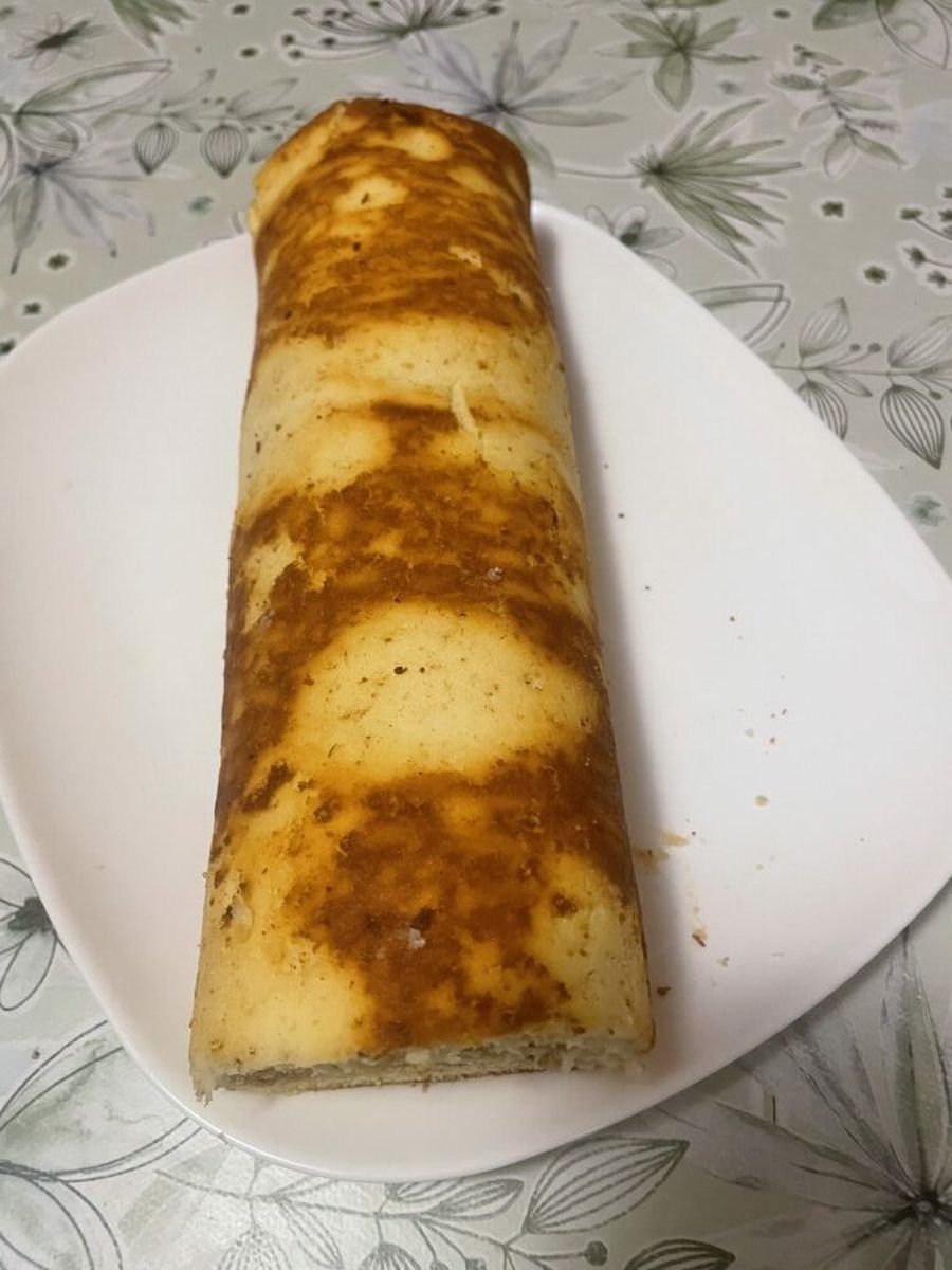 бисквит пропекся, форма 24 на 36, пышный получился, сворачивала горячим и….. как у всех столбилком) он гибкий, но не настолько что бы свернуть в рулет