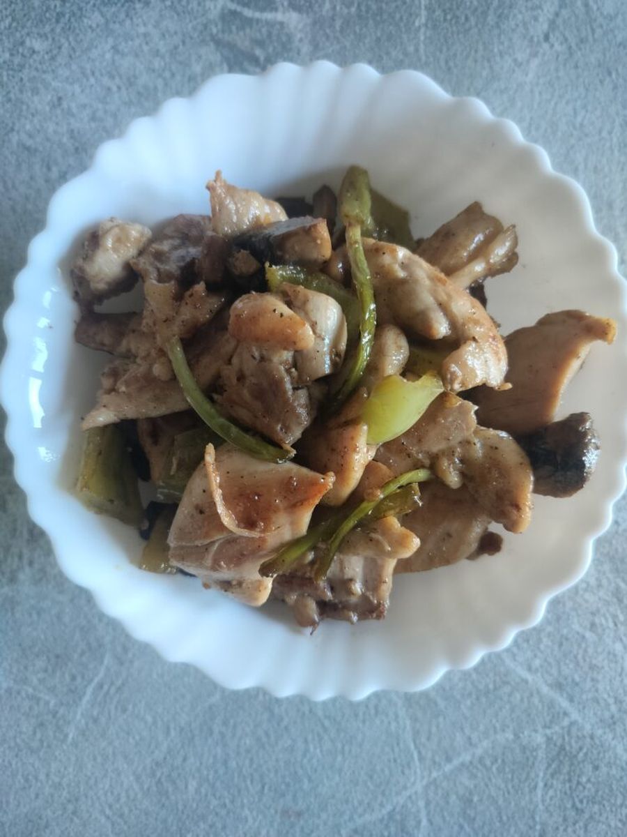 Источник: https://www.vkusnyblog.com/recipe/sote-iz-kuritsy-s-gribami-i-chesnochnymi-strelkami/Стрелки разрезаем на кусочки длиной 5-6 см. При необходимости снимаем жесткую кожицу. Из бедер вырезаем кости, снимаем кожу (по желанию). Мякоть нарезаем на небольшие кусочки. Перец нарезаем на среднего размера кусочки. Грибы режем на 2-4 части в зависимости от размера.