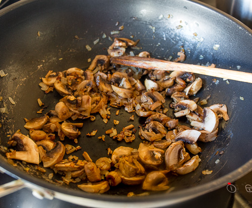 Добавляем грибы и жарим, помешивая, еще 2-3 минуты.