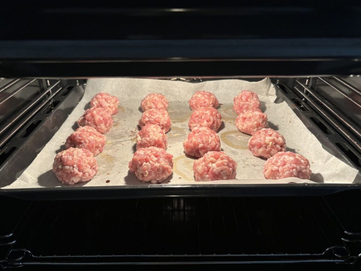 Формируем тефтели и выкладываем на застеленный фольгой противень.
