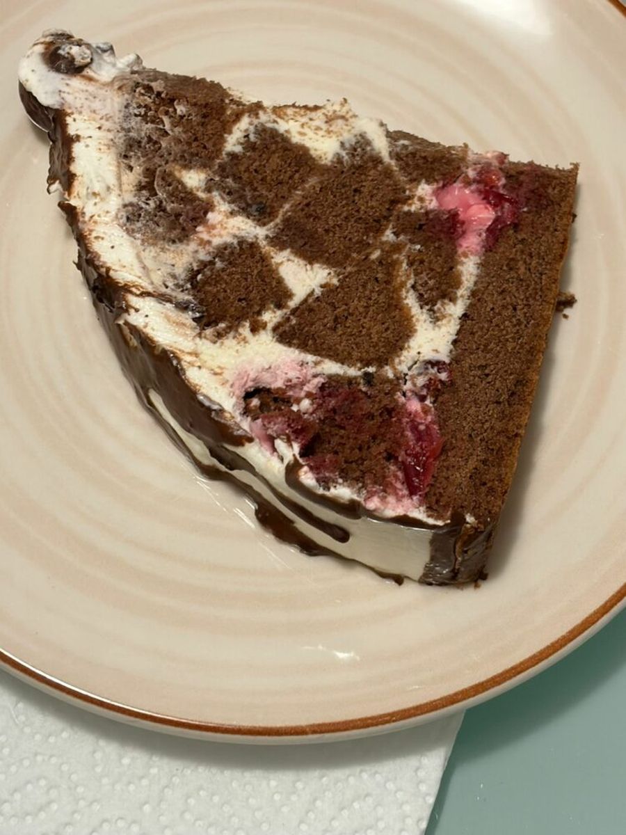 Даем шоколаду застыть, нарезаем торт и подаем.