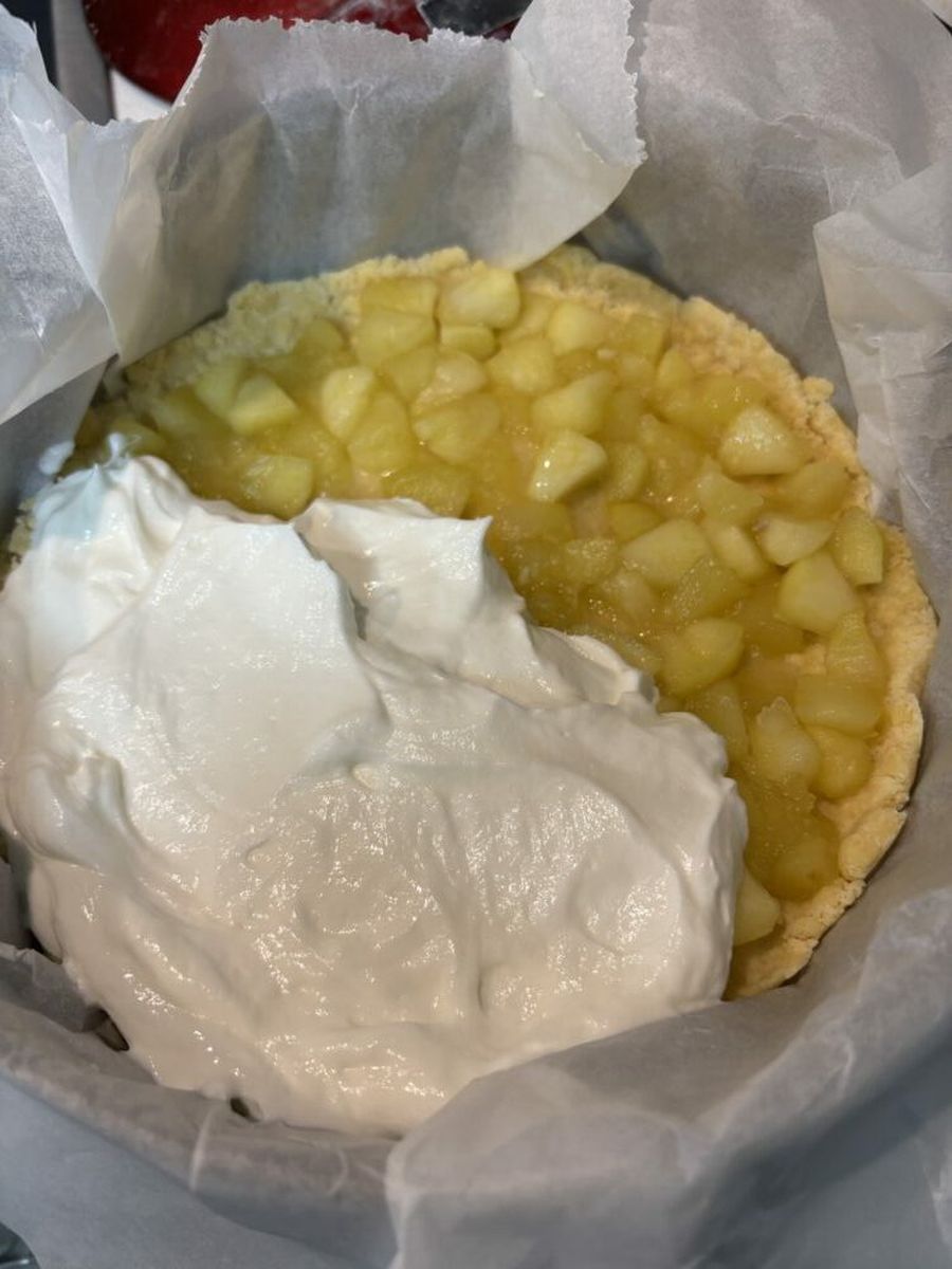 Поверх яблок укладываем сметанный крем. Разравниваем.