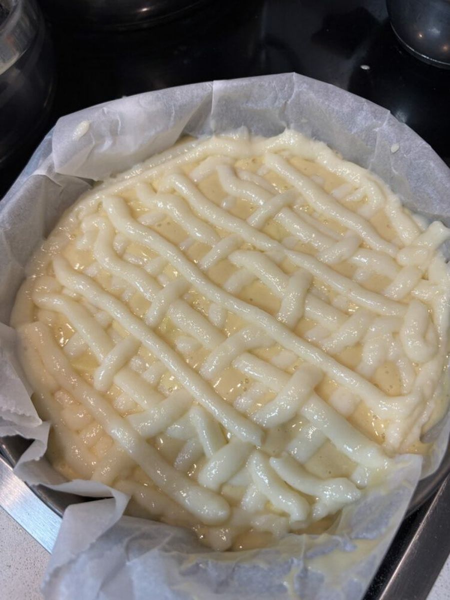 Перекладываем тесто в смазанную или застеленную пергаментом форму. Крем перекладываем в кондитерский мешок. Выкладываем на тесто в виде решетки.