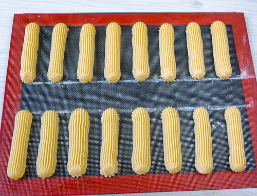 Перекладываем тесто в кондитерский мешок и отсаживаем на застеленный пергаментом или силиконом противень. У меня насадка – французская звезда, диаметр 12 мм на выходе. Мне больше всего нравится печь эклеры на перфорированном коврике.