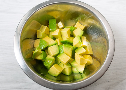 Авокадо чистим, нарезаем кубиками и поливаем лимонным соком, чтобы не потемнело.