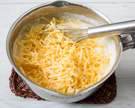 Сыр трем на крупной терке. Добавляем в горячий соус.