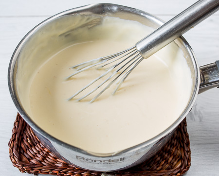 Готовим соус. Распускаем в кастрюльке сливочное масло, вмешиваем в него муку, затем понемногу, постоянно помешивая, чтобы не образовались комки, вливаем молоко (я обычно помешиваю венчиком для взбивания). И постоянно помешивая варим до загустения соуса.