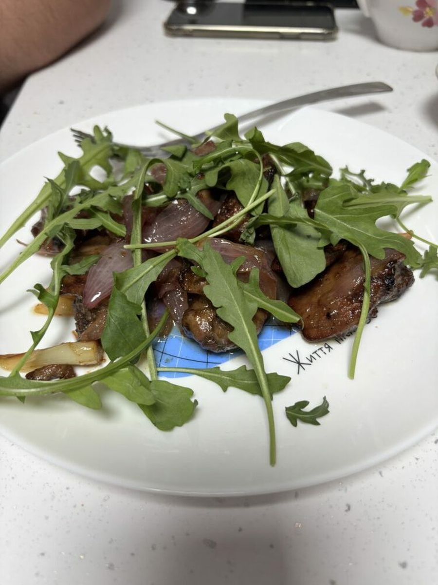 Кладем печень с луком на тарелку, посыпаем нарубленными орехами, добавляем рукколу.
